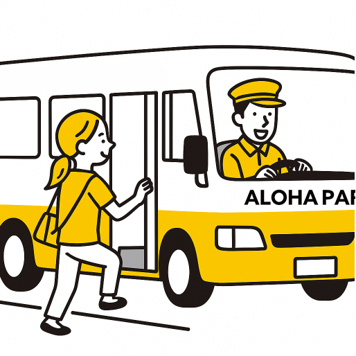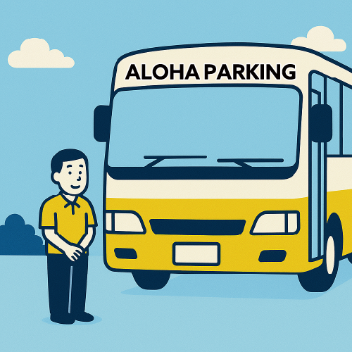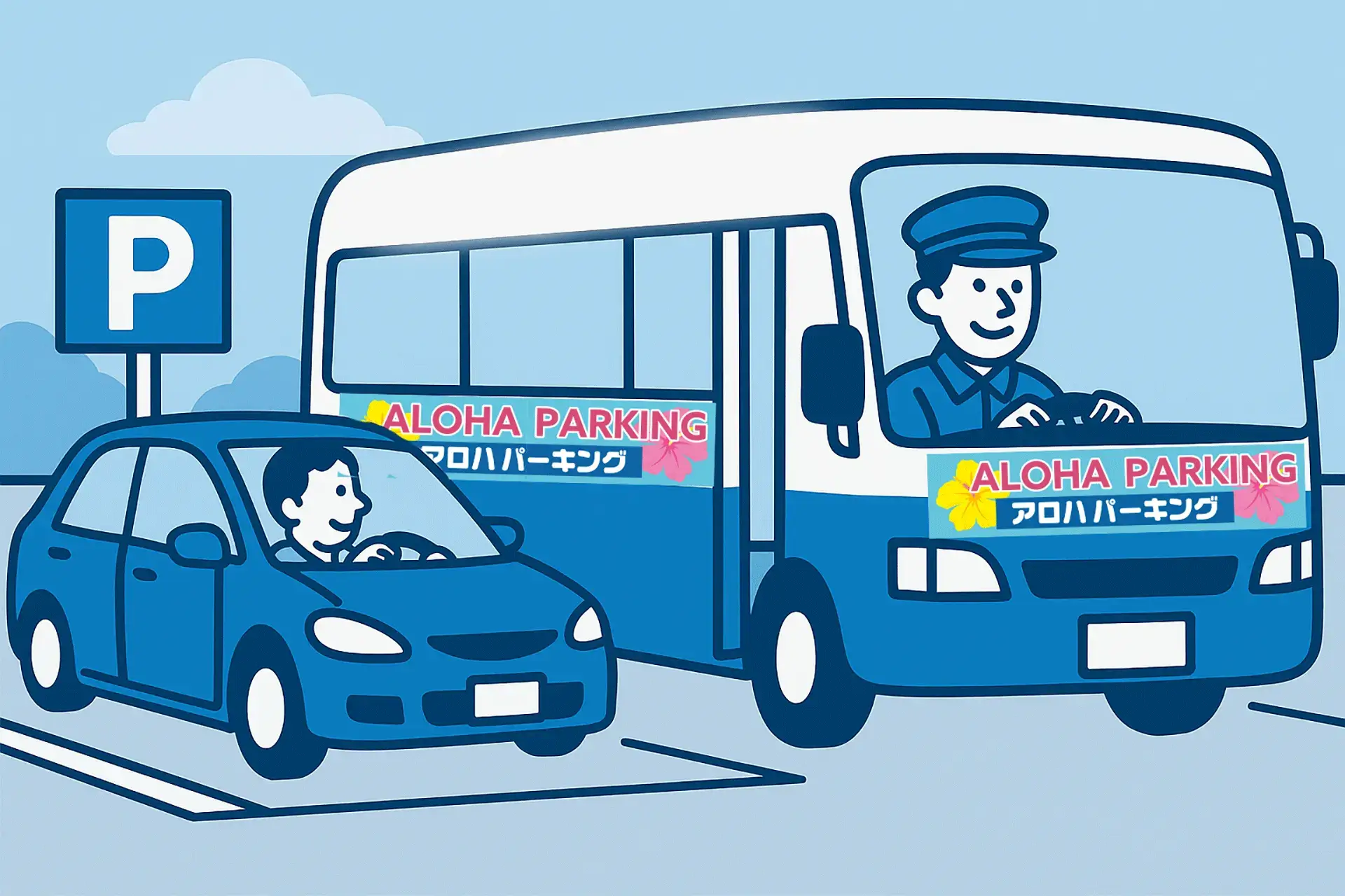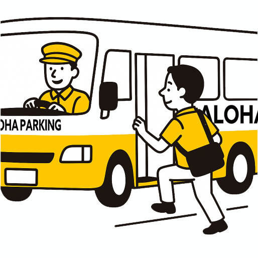2.シャトルバス(無料送迎バス)にてアロハパーキングにお送りします。5分程度です。(道路が渋滞した場合は更に遅れる場合もございます。)